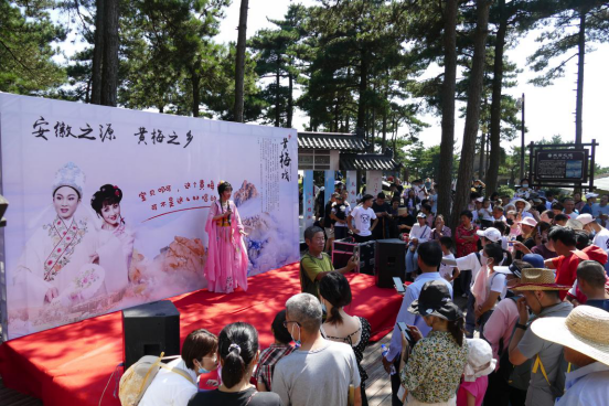 在游客服務(wù)中心及大龍窩索道上站廣場,多場黃梅戲連臺(tái)演出,臺(tái)上演員與臺(tái)下游客頻繁互動(dòng),婉轉(zhuǎn)悠揚(yáng)的黃梅鄉(xiāng)音在山谷間蕩漾,廣大游客沉醉其中,真切感受到了“樹上的鳥兒成雙對(duì),綠水青山帶笑顏”的意韻。